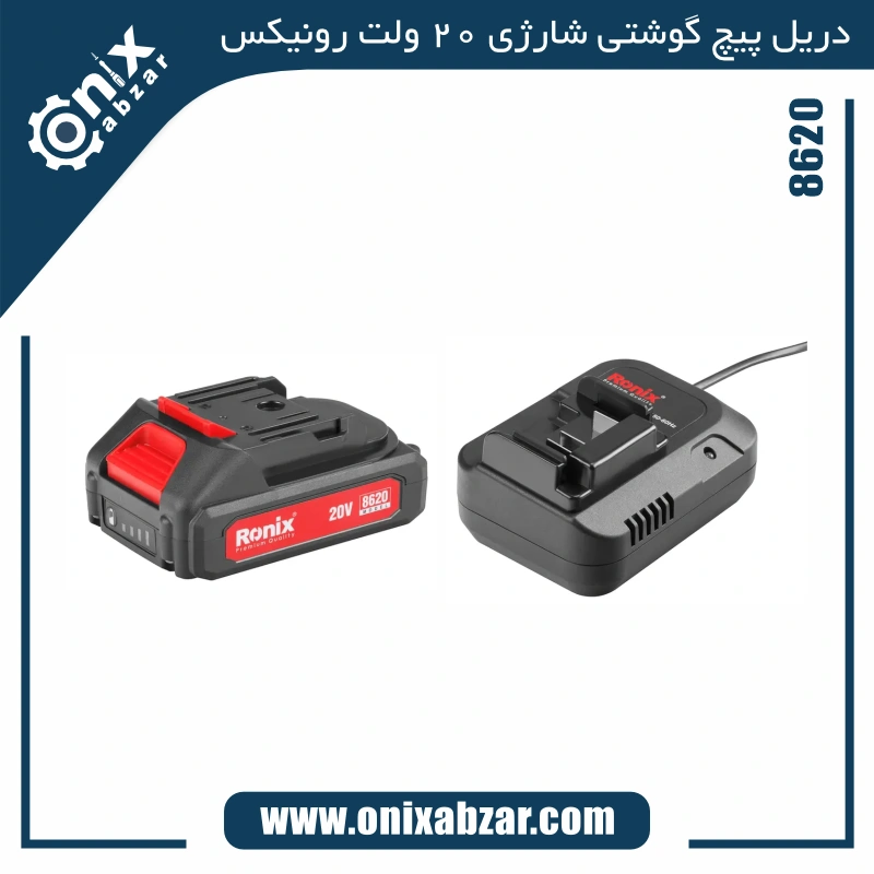 دریل شارژی رونیکس 8620 به دو عدد باتری 20 ولت لیتیوم یون با ظرفیت 1.5 آمپر ساعت مجهز است. این باتری ها طول عمر بالا و زمان کارکرد بیشتری را نسبت به باتری های معمولی ارائه می دهند. همچنین وجود شارژر سریع باعث می شود در زمان کوتاه بتوانید دوباره از ابزار استفاده کنید.